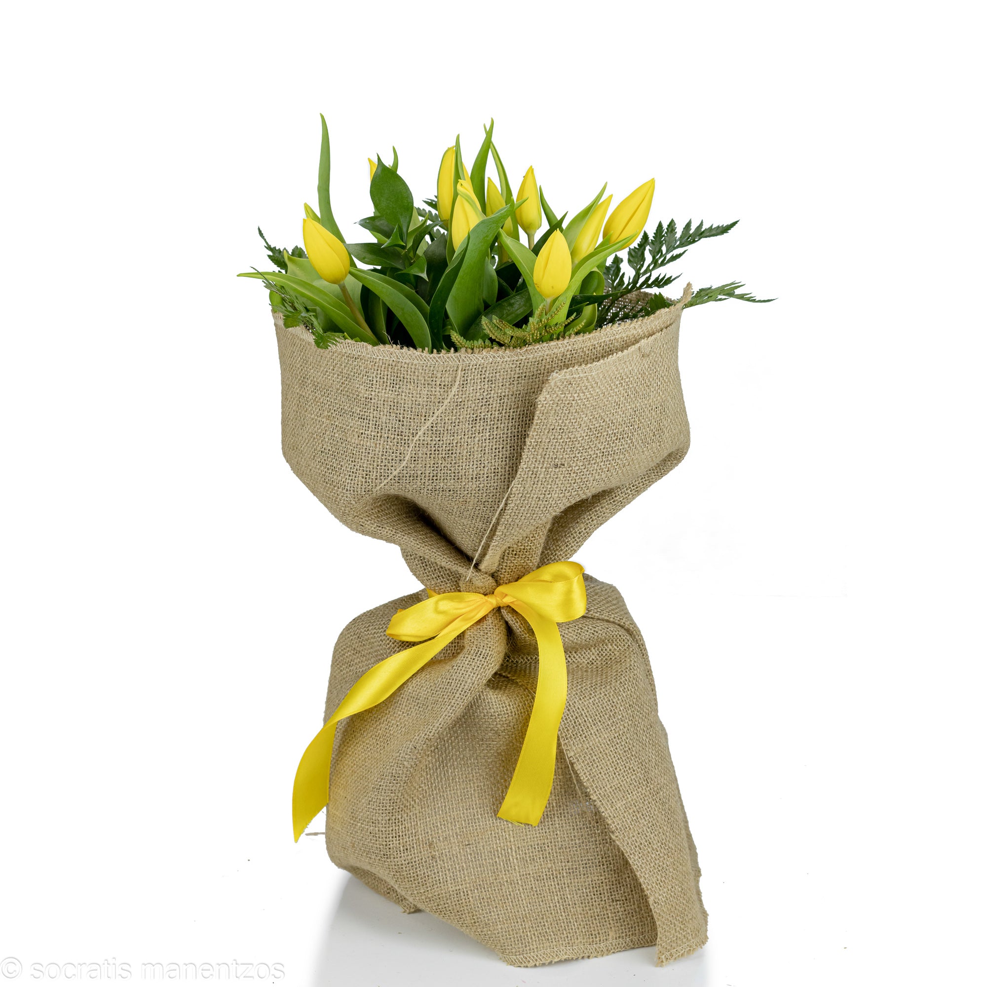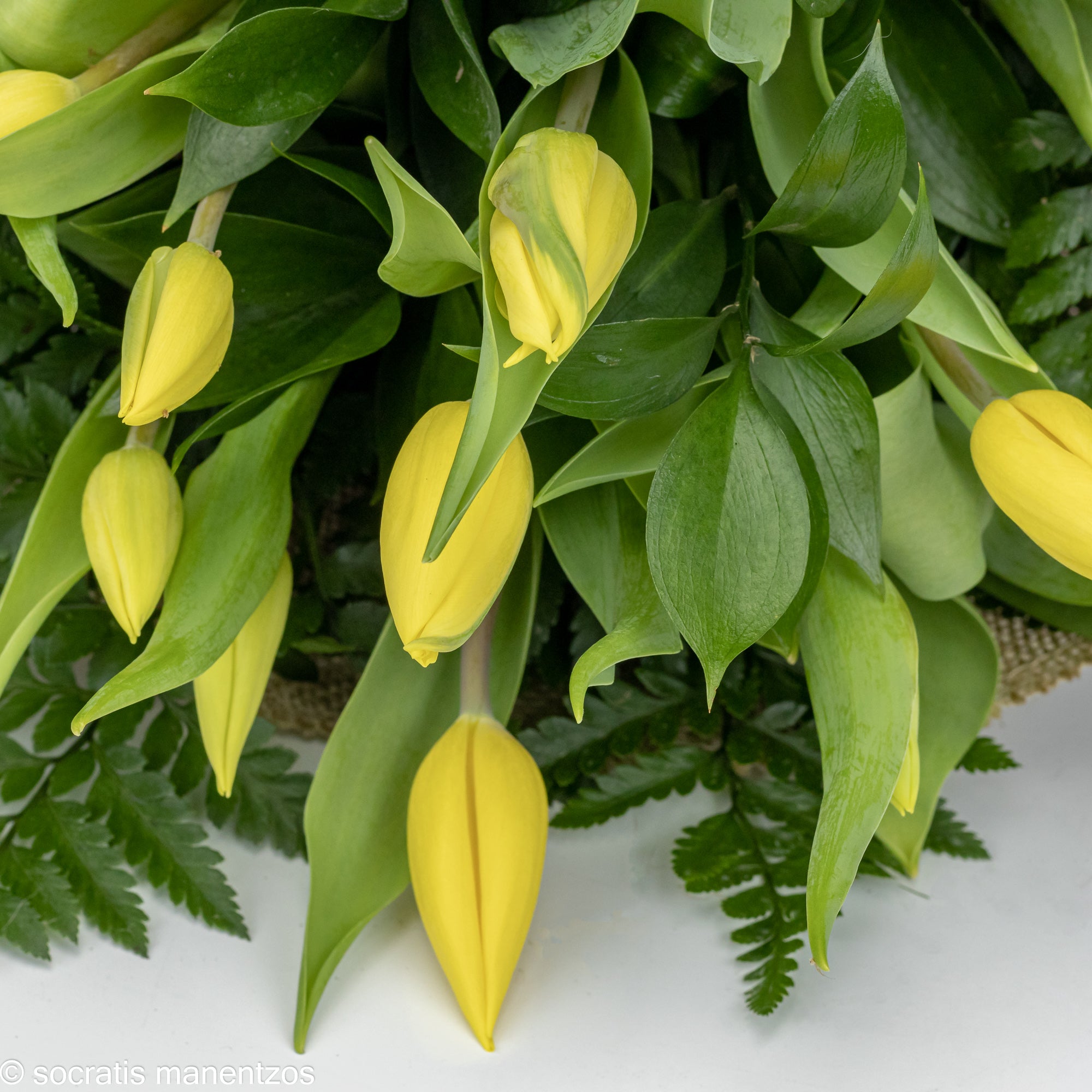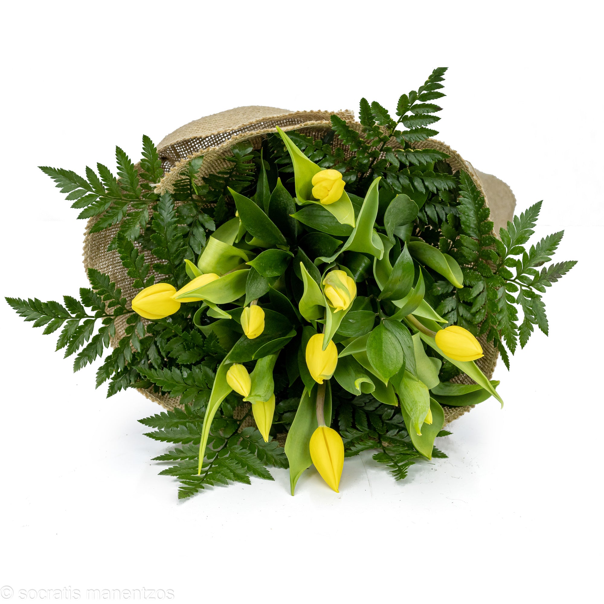 Sunny yellow tulips are a sure sign of spring. Even if the weather is not cooperating, you can be sure the person who receives this bright bouquet will feel the warmth of your message. Bouquet of 10 tulips and greenery.